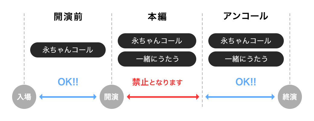 ただしコールの強要、他のお客様に迷惑となる行為、コンサートを楽しみたい方々の妨げとなる行為、に該当される方には公演中であっても係員より注意させていただきます。